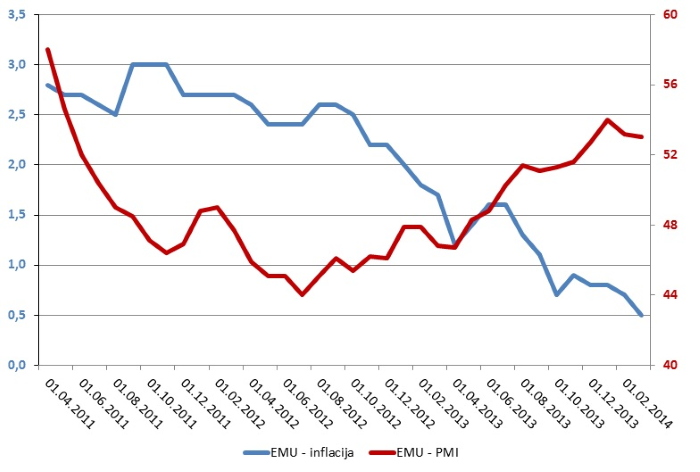 Gibanje inflacije in indeksa nakupnih managerjev (PMI) v EMU