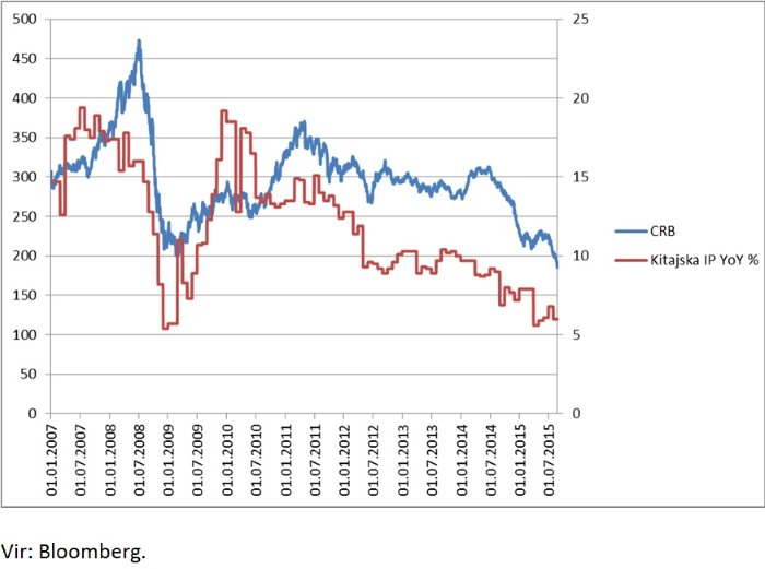 Pri tem se postavlja vprašanje, zakaj je imel QE pozitiven učinek na rast delniških naložb, ne pa tudi na rast cen surovin. Odgovor se skriva v Kitajski. Kot največja svetovna proizvodna ekonomija je Kitajska med drugim tudi največji svetovni porabnik surovin. Kot je razvidno na spodnji sliki, obstaja povezava med gibanjem cen surovin in gibanjem kitajske industrijske proizvodnje.