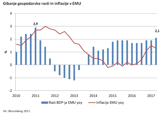 Gospodarstvo EMU je v drugem četrtletju v primerjavi s prvim zraslo za 0,6 %, rast v drugem četrtletju je na letni ravni 2,1 %. To je najvišja rast od leta 2011. Zadnji podatki potrjujejo, da se tempo rasti pospešuje in evropska gospodarstva postajajo robustna in samozadostna. Strah pred deflacijo je zaenkrat potisnjen na stran, saj se je letna rast cen v EMU varno odmaknila od nivojev okrog 0 ali negativne spirale. Junija je inflacija v EMU znašala 1,3 %. Ta nivo je bistveno višji od dna v letih 2015 in 2016, vendar še vedno močno oddaljen od ciljne inflacije ECB, ki je okrog 2 %. Posledično bistvenih premikov glede programa kvantitativnega sproščanja (QE) v letu 2017 ni za pričakovati.