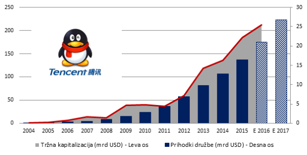 Gibanje prihodkov v primerjavi s tržno kapitalizacijo družbe Tencent